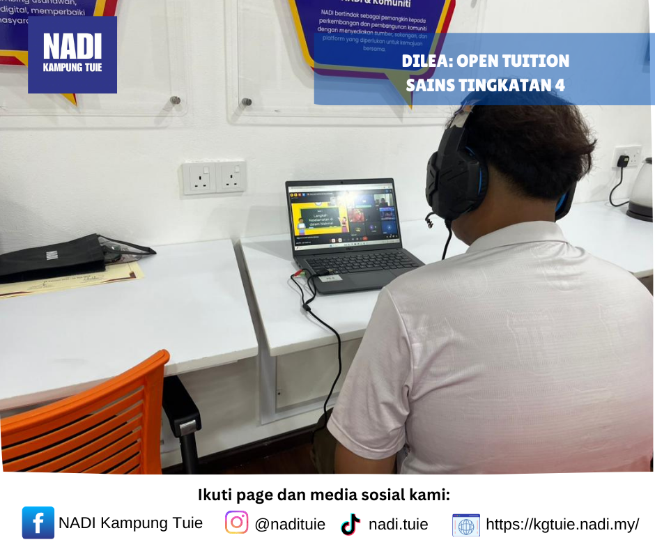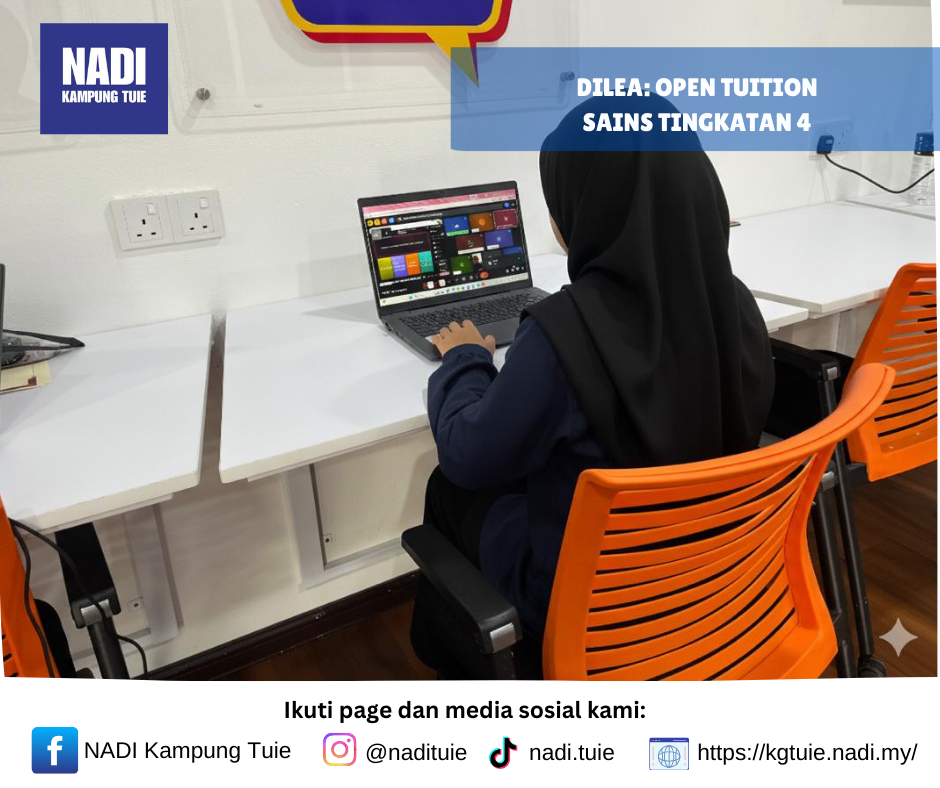 Open Tuition Sains Tingkatan 4 telah dilaksanakan pada Khamis, 15 Januari 2026 dari jam 3.30 petang hingga 4.30 petang, secara online, dengan pusat pelaksanaan bertempat di NADI Kampung Tuie.
