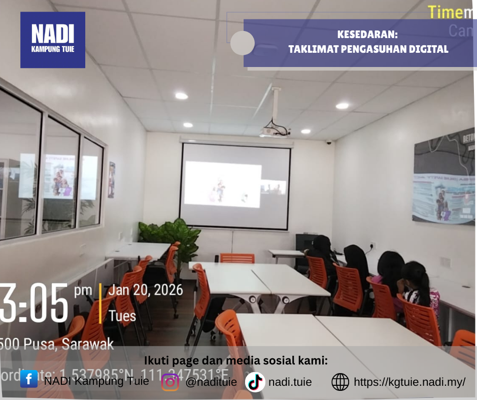 NADI x Kesedaran: Taklimat Pengasuhan Digital telah dilaksanakan pada Selasa, 20 Januari 2026 dari jam 3.00 petang hingga 4.00 petang secara online, dengan pusat pelaksanaan bertempat di NADI Kampung Tuie.