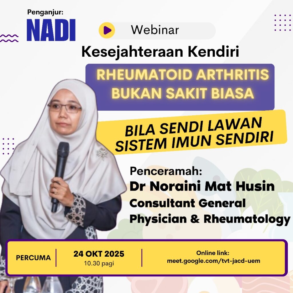 Webinar ini disampaikan oleh Dr. Noraini Mat Hussin, Consultant General Physician (Rheumatology), yang menerangkan secara mendalam mengenai penyakit Rheumatoid Arthritis (RA) — sejenis gangguan autoimun yang menyebabkan keradangan sendi, kesakitan, dan kecacatan jika tidak dirawat awal.