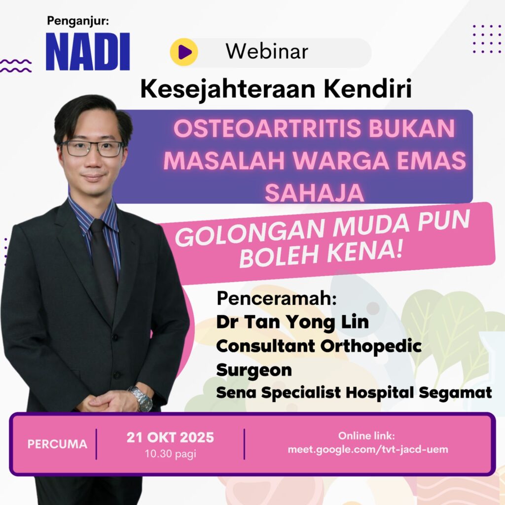 Program NADI X Kesejahteraan Kendiri dengan topik “Osteoartritis: Bukan Masalah Warga Emas Sahaja, Golongan Muda Pun Boleh Kena” telah dijalankan secara dalam talian pada 21 Oktober 2025 di NADI Kampung Tuie dan disertai oleh seorang peserta.