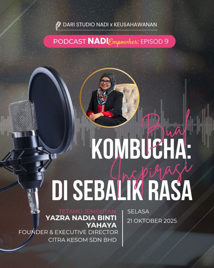 Sesi kali ini menampilkan topik Podcast Borak Kombucha: Inspirasi di Sebalik Rasa bersama tetamu jemputan Yazra Nadia binti Yahaya, Founder & Executive Director Citra Kesom Sdn. Bhd..